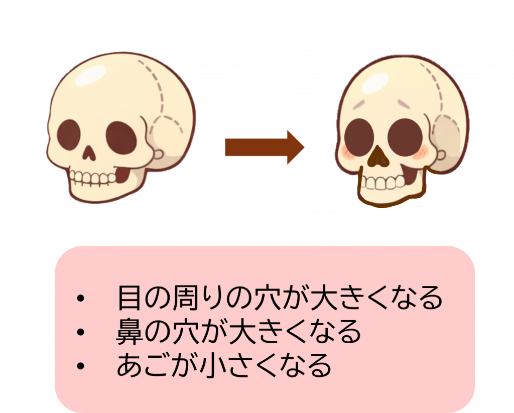 全身の骨量は20代をピークに少しずつ低下しますが、女性の場合は閉経後に急激に低下します。顔も骨量が減って縮み、目の周りと鼻の穴が大きくなり、あごが小さくなります。すると、筋肉の付き方が変わって皮膚を支える力が弱くなります。その結果、皮膚がたるみ、ほうれい線や目の下のしわなどができやすくなるのです。