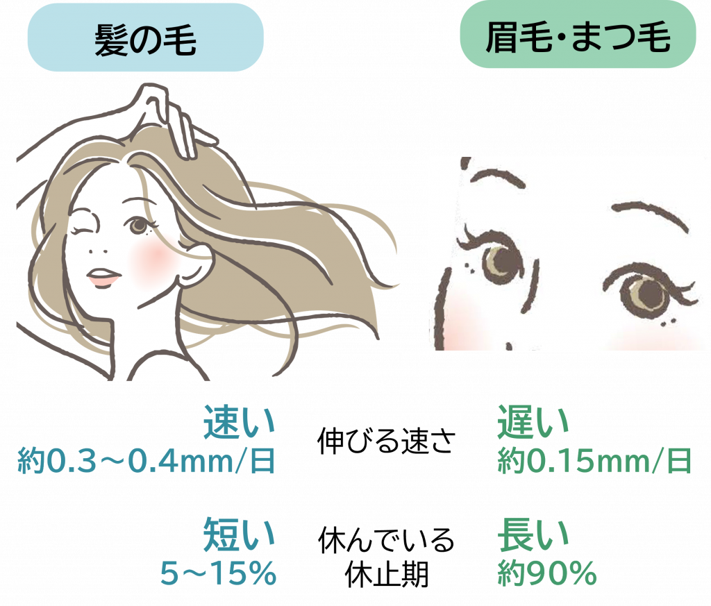 髪の毛は1日に約0.3〜0.4mm伸びます。一方で、眉毛やまつ毛は1日に約0.15mmと髪の毛の半分ほどのスピードでゆっくりと成長します。さらに、毛には伸びる時期だけでなく、成長を止めて休んでいる時期「休止期」があります。その割合を見ると、髪の毛が5〜15%なのに対し、眉毛は約90%。つまり、眉毛のほとんどは休んでいる状態。長く伸びる必要がないので、一定の長さで安定して存在している休止期が長いのです。そのため、剃ったり抜いたりすると、完全に回復するまで4〜6カ月かかると言われています。