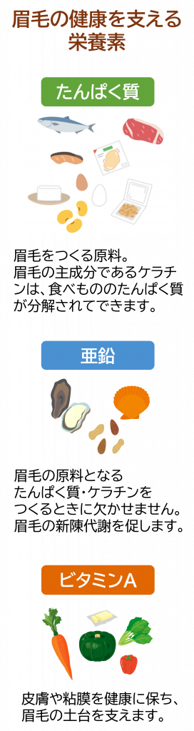 そして、もう一つ見逃せないのが身体の内側との関係です。眉毛も髪の毛や肌と同じく、身体の中でつくられ、血流によって運ばれる栄養素を使って育ちます。主な材料となるのはたんぱく質。加えて、亜鉛やビタミンAといった栄養素が欠かせません。これらが不足すると、毛が細くなったり、ハリを失ったりする可能性が報告されています。
