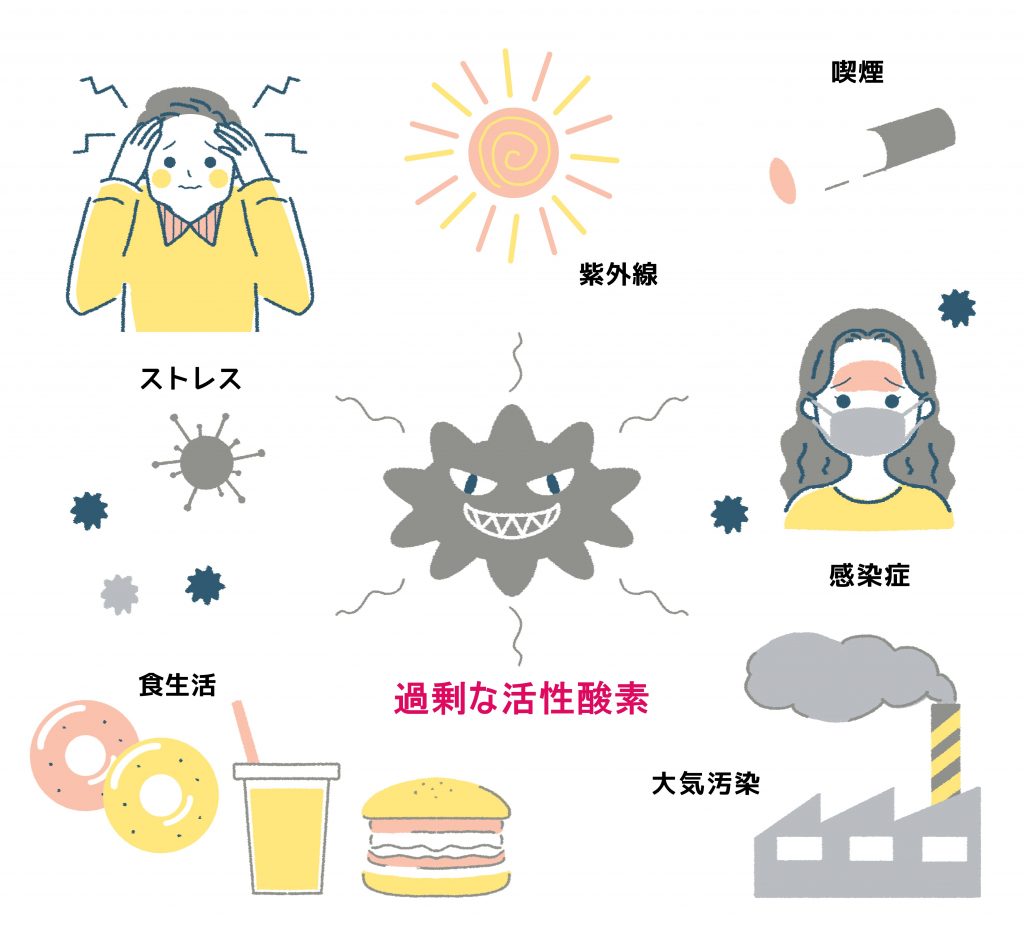 活性酸素が増える要因としては、紫外線、喫煙、感染症、大気汚染、乱れた食生活、ストレスなどが挙げられます。