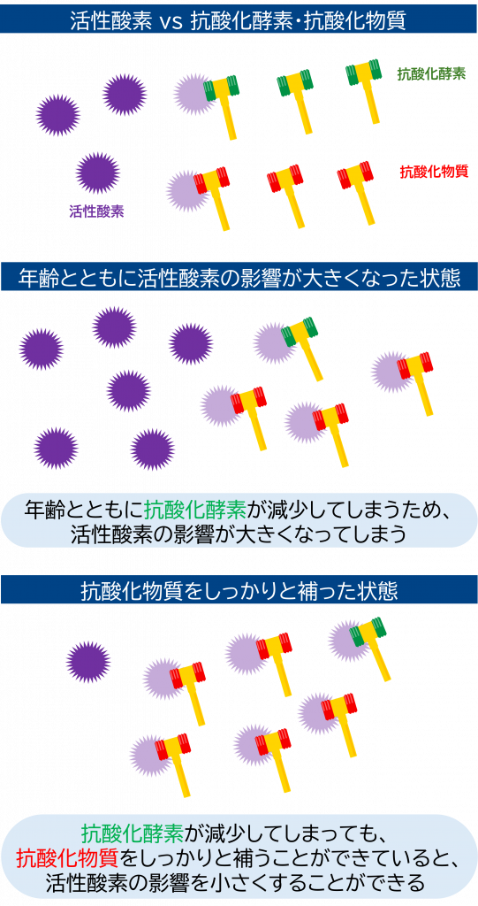 私たちはもともと活性酸素を分解して無毒化する「抗酸化酵素」を持っています。しかし、年齢とともに抗酸化酵素は少なくなり、活性酸素の影響を受けやすくなります。