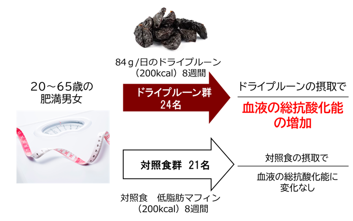 脂質異常症や糖尿病と診断されたことがなく、代謝に影響する薬を服用しておらず、中~高強度の運動を週に2時間以上行っていない、20~65歳の肥満(BMI 25以上)男女45人を対象に試験が行われました。対象者を2つのグループに分け、1日あたり200kcalの間食としてドライプルーン(84g)または、対照食の低脂肪マフィンを午前と午後に分けて、8週間摂取してもらいました。試験前と8週間後に採血を行い、血液の総抗酸化能※を測定しました。